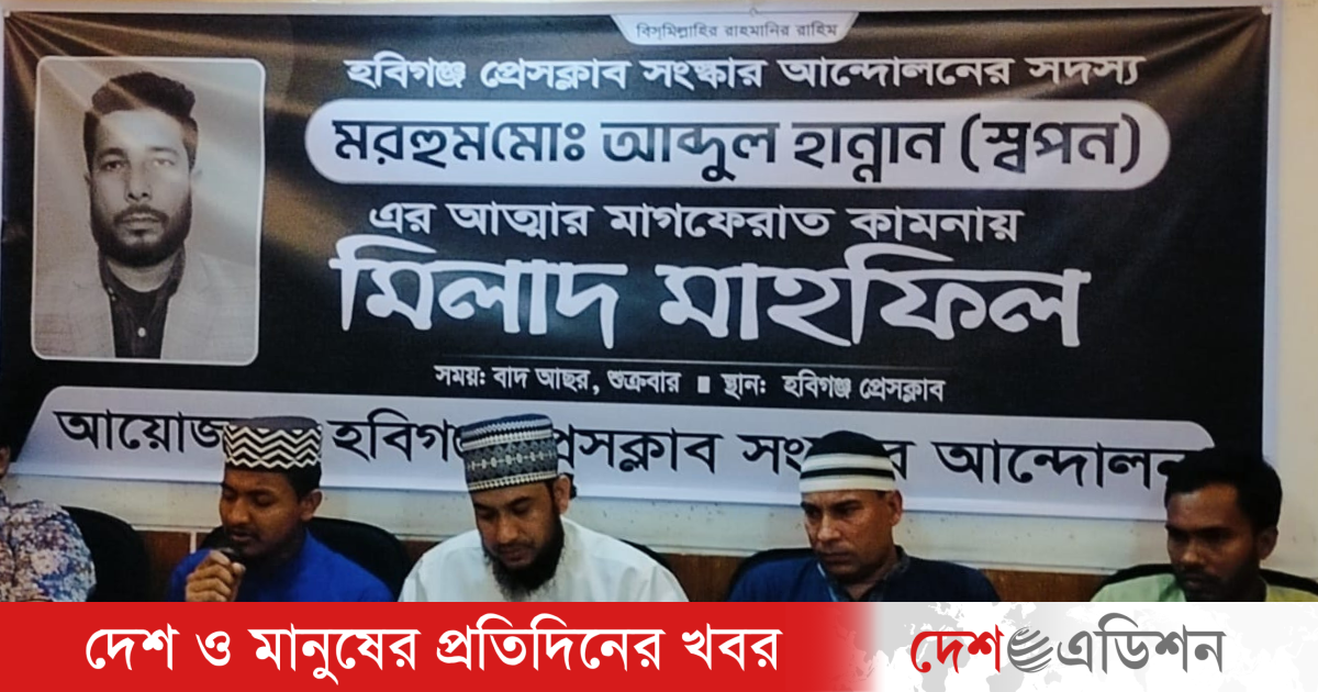 হবিগঞ্জ প্রেসক্লাব-এ সাংবাদিক মহুরম আব্দুল হান্নান স্বপনের আত্মার মাগফেরাত কামনায় আবেগঘন দোয়া ও মিলাদ মাহফিল অনুষ্ঠিত হয়েছে। হবিগঞ্জ প্রেসক্লাব সংস্কার আন্দোলনের আয়োজনে গত ১৭ এপ্রিল, শুক্রবার বাদ আছর এই আয়োজন করা হয়।