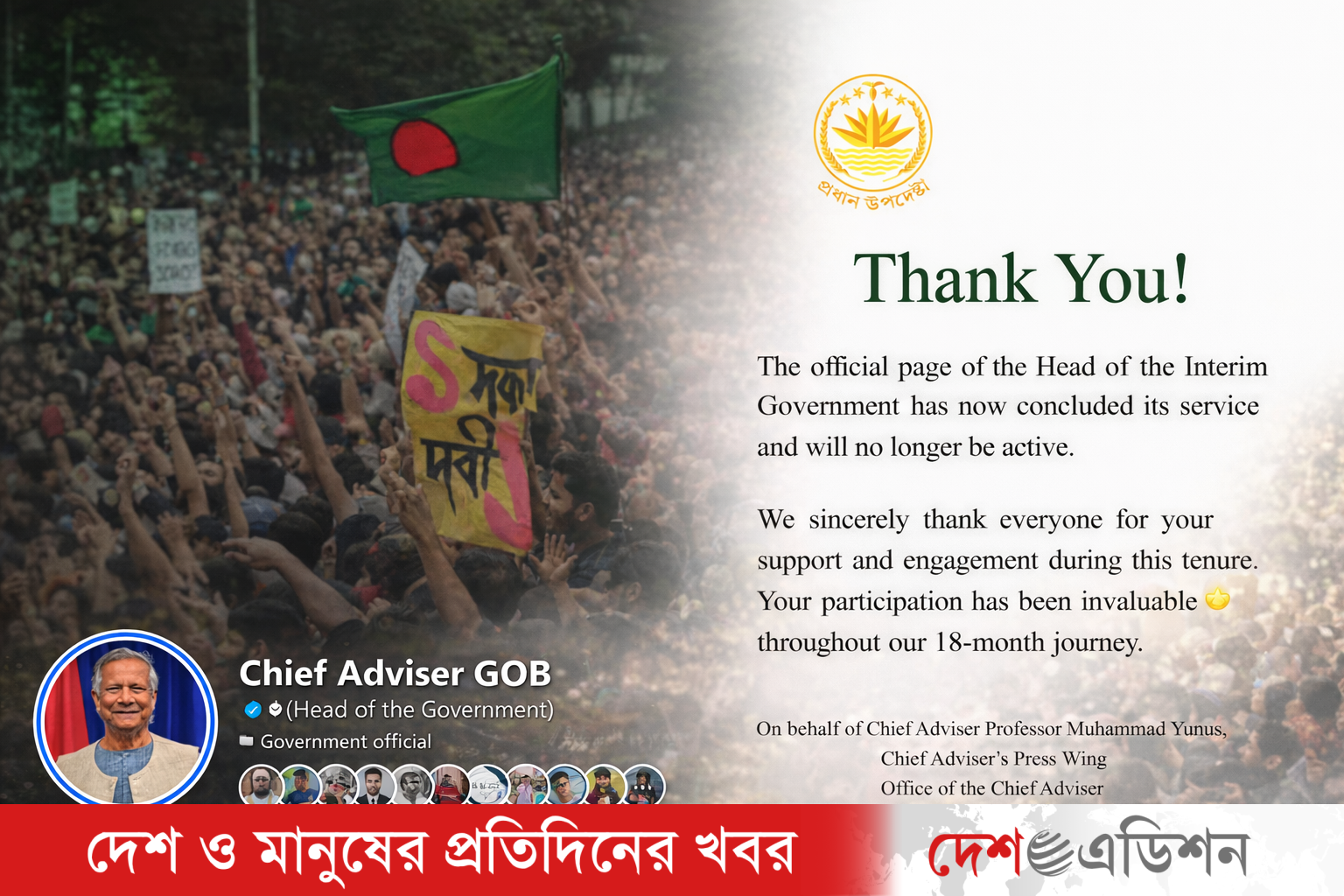 দেশ এডিশনের পক্ষ থেকে বলা যায়, কিছু পেজ বন্ধ হয়—কিন্তু কিছু অধ্যায় কখনো বন্ধ হয় না। দায়িত্বশীল নেতৃত্ব, স্বচ্ছ যোগাযোগ এবং রাষ্ট্রীয় দায়বদ্ধতার যে দৃষ্টান্ত এই পেজ রেখে গেছে, তা আগামী দিনেও অনুপ্রেরণা হয়ে থাকবে।